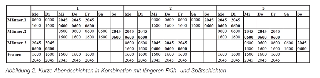 | kurze Abenddienste | viel Arbeit am Abend oder Verlängerung der Betriebszeit um einen Teil einer Schicht (zB 8 h + 4 h pro Tag) | PartnerInnen (iwS) übernehmen Kind, wenn dies von Dienstzeiten möglich ist |