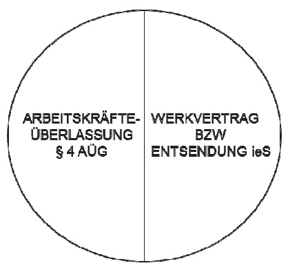Wie auch immer, festzuhalten ist, dass die Definition der Arbeitskräfteüberlassung nach dem AÜG und die Definition des EuGH zur Arbeitskräfteüberlassung nicht deckungsgleich sind. Es gibt einen Bereich, wo sich beide Definitionen decken. Es gibt aber auch einen Bereich, wo die Definition der Arbeitskräfteüberlassung nach dem AÜG weiter ist als die Definition des EuGH. Dieser Bereich wird im Folgenden als „AÜ+“ bezeichnet. Er fällt nach dem AÜG in den Bereich der Arbeitskräfteüberlassung, nach dem EuGH in den Bereich der Entsendung auf Grund eines Werkvertrages, also in den Bereich Entsendung ieS (siehe Abbildung C).