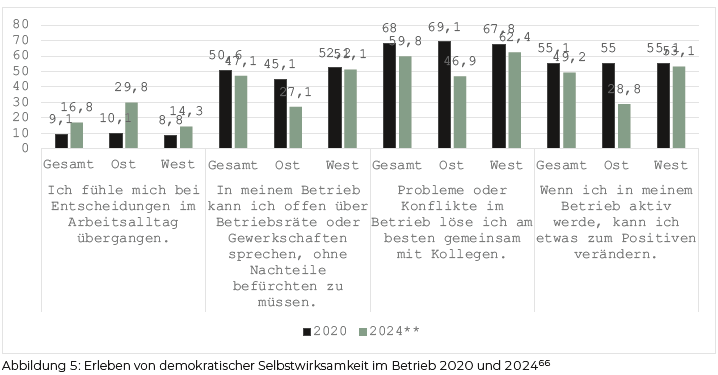 Der zuletzt zunehmende Druck in der Arbeitswelt hat Konsequenzen für das Erleben von Selbstwirksamkeit der Beschäftigten im Betrieb. Mit einem selbstentwickelten Fragebogen konnten wir 2020 und 2024 jeweils abfragen, wie viel Solidarität, Anerkennung und Mitbestimmung die Beschäftigten im Betrieb erleben (Abbildung 5). Im Vergleich zeigt sich eine deutliche Verschlechterung im Osten und ein immer noch wahrnehmbarer Rückgang im Westen. Insb stimmten im Osten 2020 der Frage „In meinem Betrieb kann ich offen über Betriebsräte und Gewerkschaften sprechen“ noch 45,1 % zu (immerhin 7 % weniger als im Westen). 2024 sackte dieser Wert auf 27,1 % ab (im Westen ist der Rückgang statistisch unbedeutend). Aber auch im Westen fühlten sich 2024 mehr Beschäftigte übergangen und Probleme werden weniger selbstverständlich mit den Kolleg:innen gelöst. Zum einen hängt dieses Erleben mit den Arbeitsbedingungen zusammen, zum anderen aber hat es Auswirkungen darauf, wie sich die Menschen politisch mitgenommen fühlen und darüber vermittelt auch darauf, wie zufrieden sie mit der Demokratie sind.